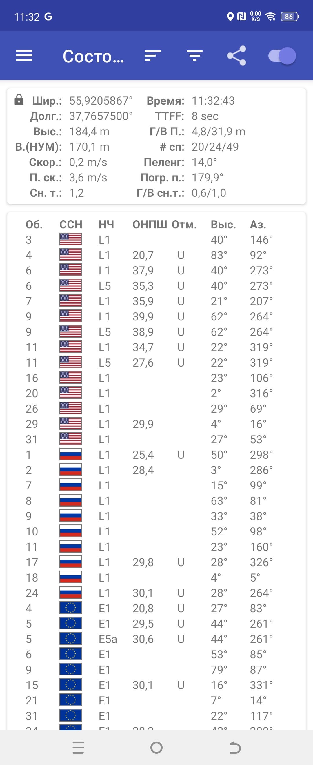 - GPS, Galileo, Глонасс, QZSS, BDS