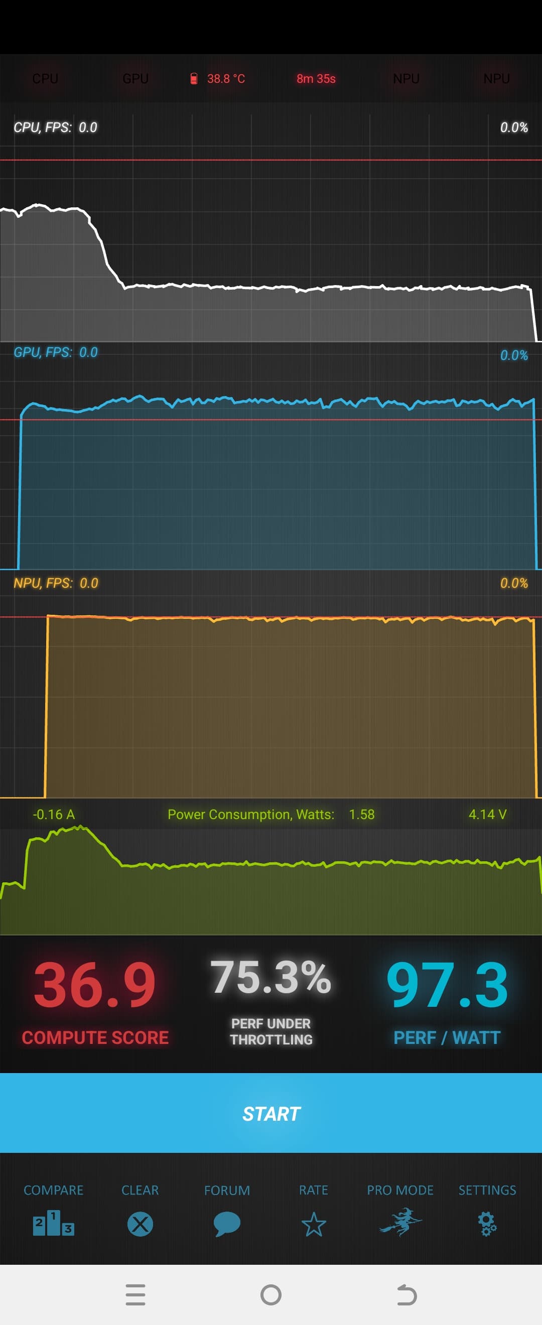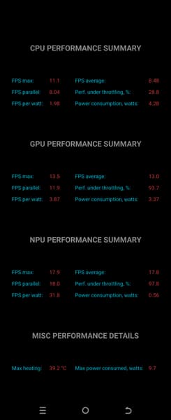 Тест на снижение производительности при нагреве мы проводим с помощью программы Burnout Benchmark, которая позволяет нагружать CPU, GPU и NPU: