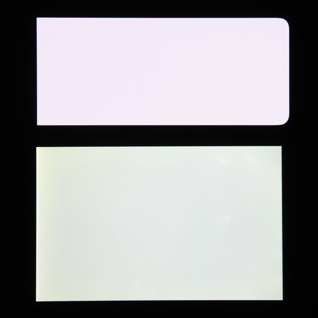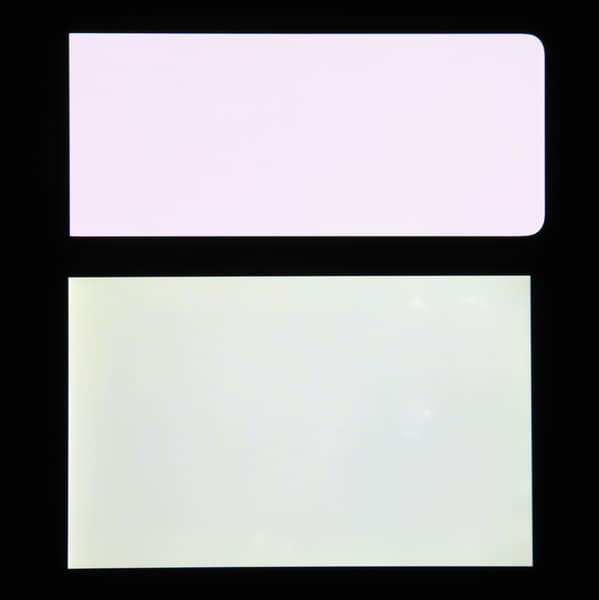 Экраны характеризуются великолепными углами обзора. Правда, белый цвет при отклонении на большие углы приобретает легкий сине-зеленый оттенок. Яркость под углом у всех экранов (если сравнивать еще и с Nexus 7) уменьшается, но в случае смартфона падение яркости выражено гораздо меньше. В итоге, даже если установить формально одинаковую яркость экраны этого смартфона визуально выглядят гораздо более яркими (в сравнении с ЖК-экранами), так как на экран мобильного устройства часто приходится смотреть как минимум под небольшим углом. Черный цвет у смартфона остается просто черным под любыми углами. Он настолько черный, что параметр контрастности в данном случае неприменим. Для сравнения приведем фотографии, на которых на основной экран смартфона и экран второго участника (Nexus 7; снизу — Nexus 7, сверху — смартфон) выведены одинаковые изображения, при этом яркость экранов изначально установлена примерно на 200 кд/м², а цветовой баланс на фотоаппарате принудительно переключен на 6500 К.