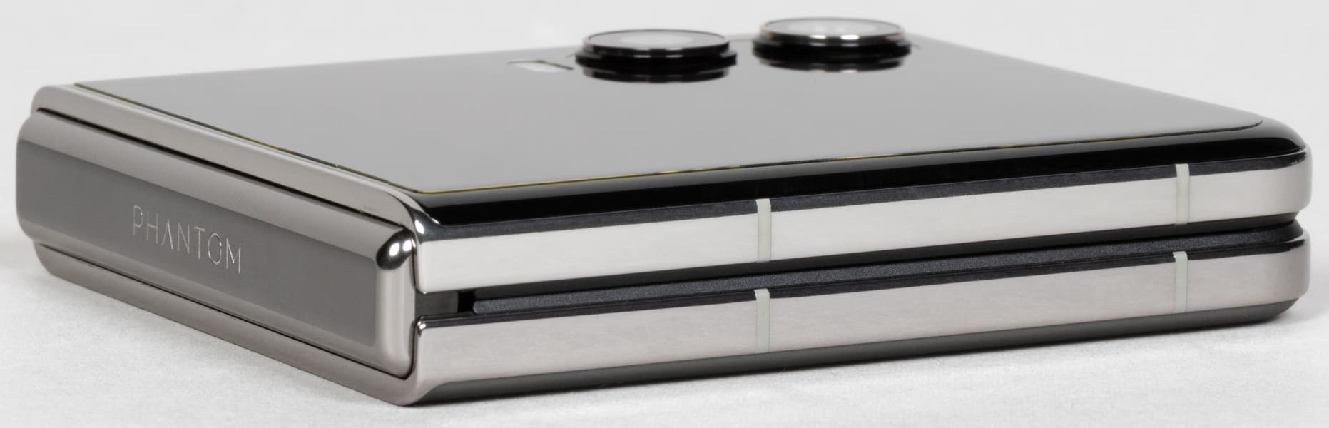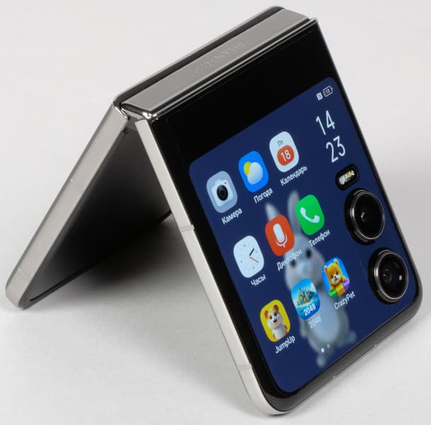 Смартфон Tecno Phantom V Flip2 5G выполнен в форм-факторе вертикальной раскладушки. У нее створки корпуса раскладываются не как у книжки, а как у стандартных телефонов-раскладушек прошлого. Правда, теперь такую «раскладушку» невозможно легко и изящно расхлопнуть одной рукой — приходится каждый раз аккуратно и с определенной долей усилия раскрывать створки с помощью пальцев обеих рук.