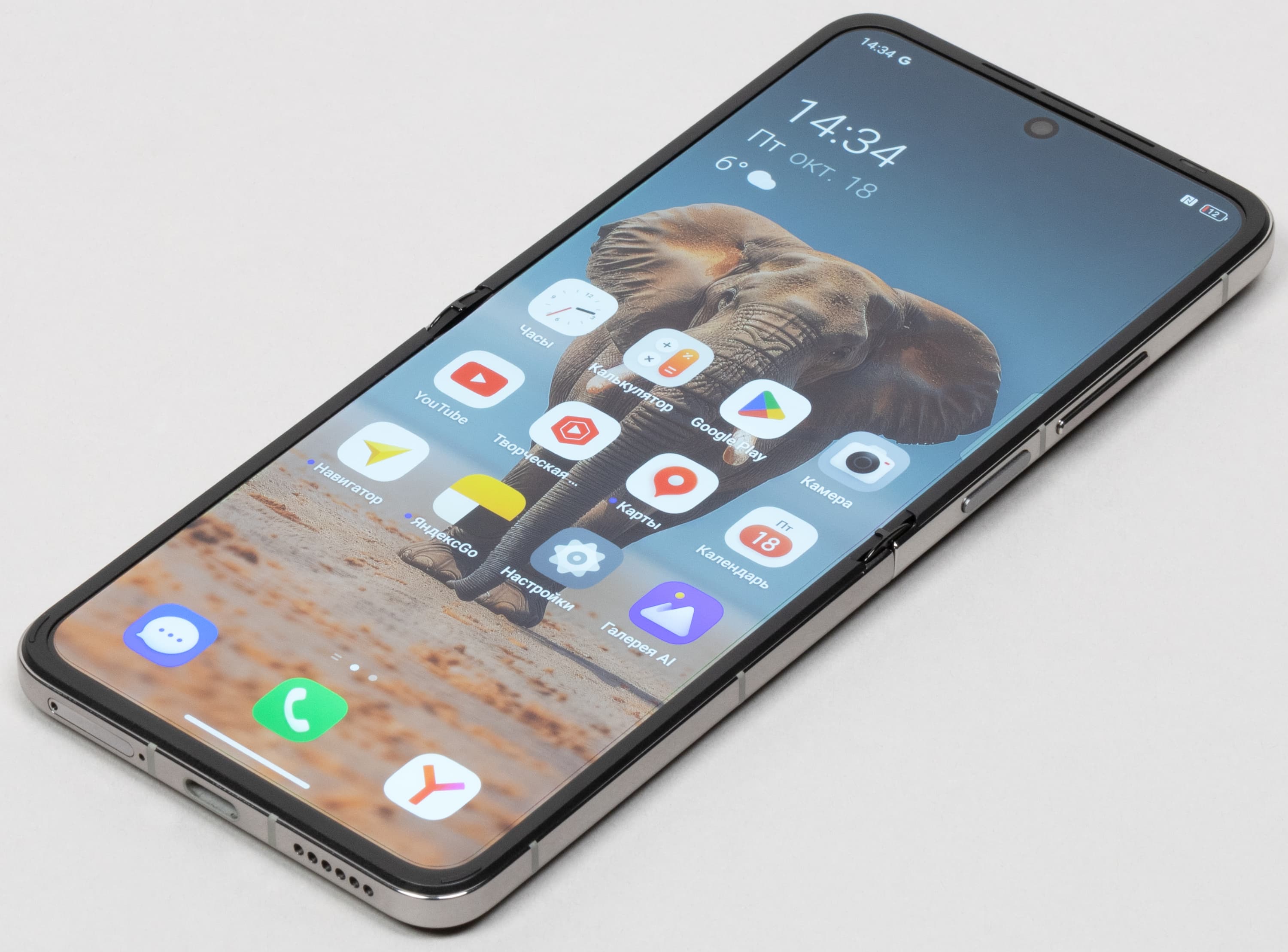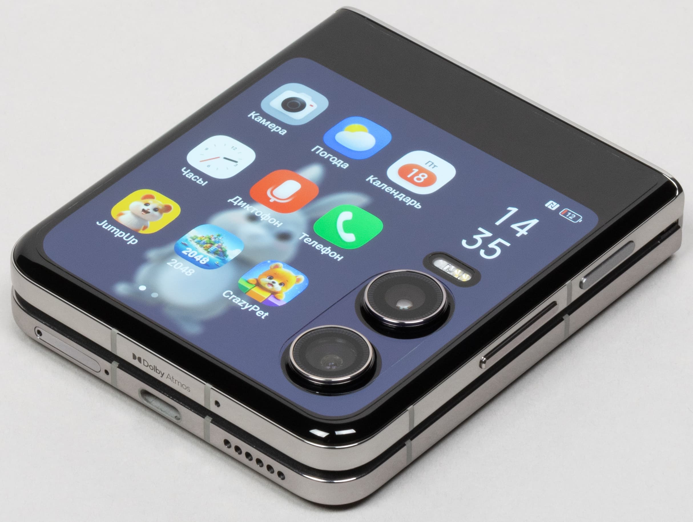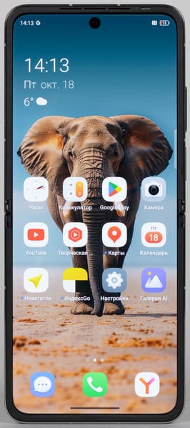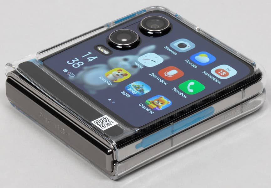 В раскрытом виде смартфон далеко не миниатюрен. Наоборот, после раскрытия Tecno Phantom V Flip2 5G представляет собой максимально крупный аппарат с огромным почти семидюймовым дисплеем. По габаритам такая раскрытая «раскладушка» оказывается крупнее большинства моноблочных смартфонов.