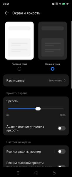 При выводе белого поля во весь экран и при ручном управлении яркостью ее максимальное значение составило 460/480 кд/м² (основной/внешний экраны) в обычных условиях, а на очень ярком свету при включенной опции Режим высокой яркости оно повышается до 910/960 кд/м². Максимальная яркость очень высокая. Также нужно учитывать тот факт, что в данном случае чем меньше площадь белого на экране, тем он светлее, то есть фактическая максимальная яркость белых участков будет почти всегда выше указанного значения. В итоге читаемость обоих экранов днем на солнце должна быть на отличном уровне, а темная тема не только экономит заряд аккумулятора, но способствует лучшей разборчивости информации на экране в условиях высокой освещенности. Минимальное значение при ручном управлении яркостью — 2/2 кд/м², то есть пониженный уровень яркости без проблем позволяет использовать устройство даже в полной темноте. Работает автоматическая регулировка яркости по датчикам освещенности (у основного экрана он расположен под экраном близко к верхнему краю левее камеры, а у дополнительного — в блоке со вспышками). Работа этой функции зависит от положения ползунка регулировки яркости: им пользователь может попытаться выставить желаемый уровень яркости в текущих условиях. Если оставить все по умолчанию, то в полной темноте функция автояркости уменьшает яркость до 5/5 кд/м² (темновато), в условиях освещенного искусственным светом офиса (примерно 550 лк) устанавливает на 100/140 кд/м² (нормально), а условно под прямыми лучами солнца повышает до 910/960 кд/м² (отлично). Результат по умолчанию нас не удовлетворил, поэтому мы попробовали повысить яркость в полной темноте. Яркость стала выше, но после цикла повышения внешней освещенности и ее снижения, все вернулось к тем же значениям, что были до вмешательства. Получается, что функция автоподстройки яркости работает не совсем адекватно и не позволяет пользователю настраивать свою работу под индивидуальные требования.