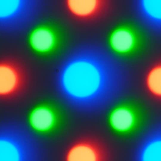 В обоих экранах используется матрица Super AMOLED — активная матрица на органических светодиодах. Полноцветное изображение создается с помощью субпикселей трех цветов — красного (R), зеленого (G) и синего (B), но красных и синих субпикселей в два раза меньше, что можно обозначить как RGBG. Это подтверждается фрагментом микрофотографии: