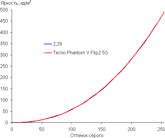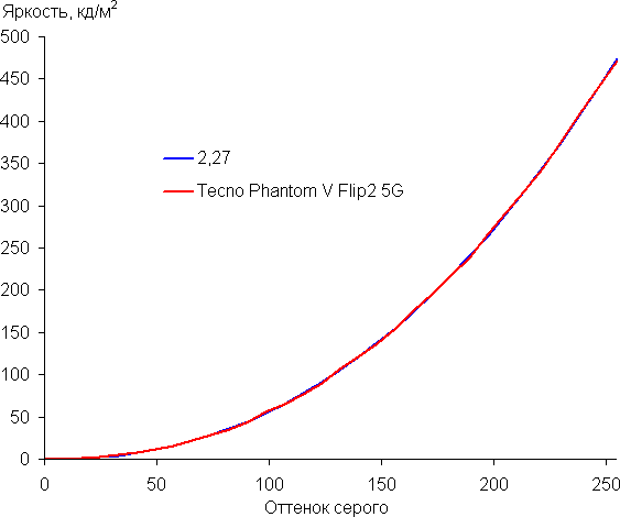 Напомним, что в случае OLED-экранов яркость фрагментов изображения динамично меняется в соответствии с характером выводимого изображения — уменьшается для светлых в целом изображений. В итоге полученная зависимость яркости от оттенка (гамма-кривая), скорее всего, немного не соответствует гамма-кривой статичного изображения, так как измерения проводились при последовательном выводе оттенков серого почти на весь экран.