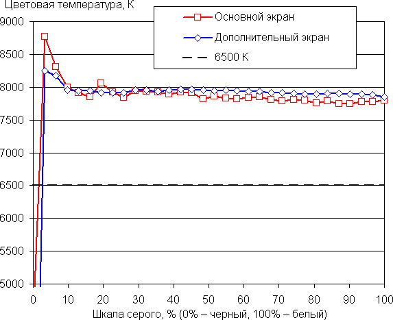 Баланс оттенков на шкале серого компромиссный, так как цветовая температура существенно выше стандартных 6500 К, но хотя бы отклонение от спектра абсолютно черного тела (ΔE) ниже 10 единиц, что для потребительского устройства считается приемлемым показателем. При этом цветовая температура и ΔE мало изменяются от оттенка к оттенку — это положительно сказывается на визуальной оценке цветового баланса: