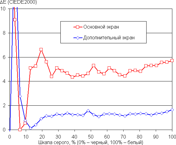 (Самые темные области шкалы серого в большинстве случаев можно не учитывать, так как там баланс цветов не имеет большого значения, да и погрешность измерений цветовых характеристик на низкой яркости большая.) В этом устройстве есть возможность скорректировать цветовой баланс регулировки цветовой температуры, но при eё снижении растет ΔE, поэтому заниматься такой коррекцией смысла нет.
