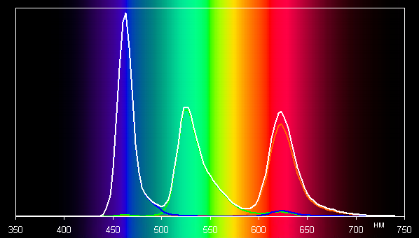 В первом случае спектры компонент (то есть спектры чистых красного, зеленого и синего цветов) очень хорошо разделены: