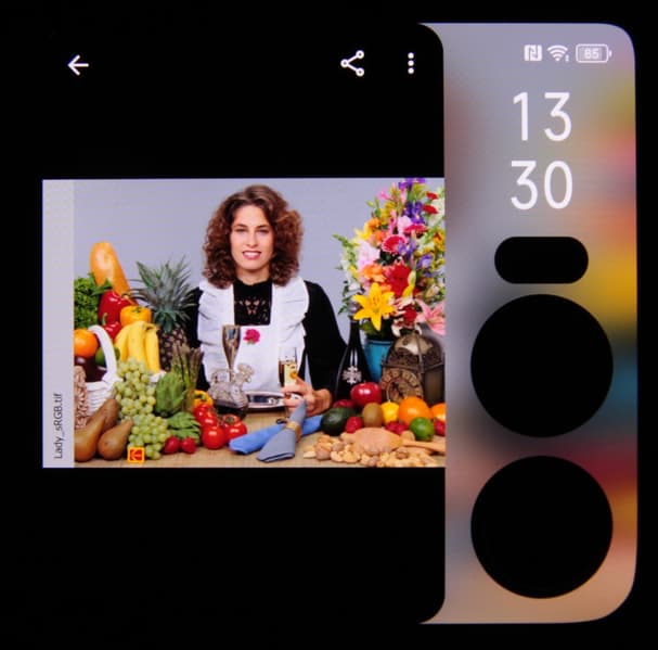 Подведем итоги. Оба экрана имеют очень высокую максимальную яркость (910/960 кд/м²) и обладают отличными антибликовыми свойствами, поэтому устройством без особых проблем можно пользоваться вне помещения даже летним солнечным днем. В полной темноте яркость можно понизить до комфортного значения (вплоть до 2 кд/м²). Допустимо использовать режим с автоматической подстройкой яркости, работающий, правда, с нашей точки зрения, не совсем адекватно. К достоинствам экранов нужно отнести эффективное олеофобное покрытие, отсутствие видимого мерцания, поддержку режимов с высокой частотой обновления 90 и 120 Гц, а также, в случае основного экрана, правильную поддержку цветовых профилей (по крайне мере sRGB и DCI-P3 при выборе правильного профиля и при использовании штатной программы Галерея AI). Заодно напомним про общие достоинства OLED-экранов: истинный черный цвет (если в экране ничего не отражается), заметно меньшее, чем у ЖК, падение яркости изображения при взгляде под углом. В целом качество экранов очень высокое.