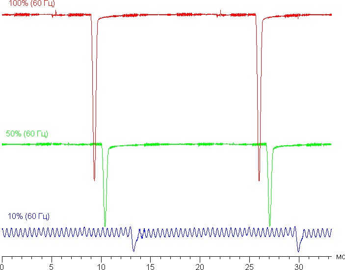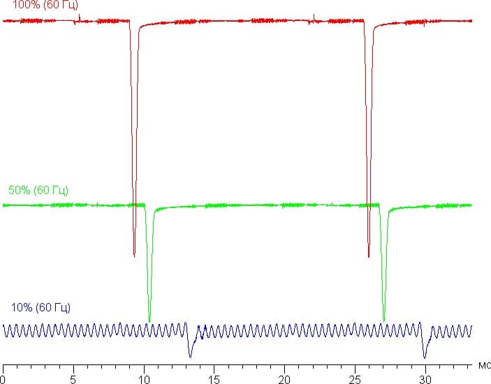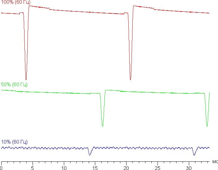 На высоком и среднем уровне яркости присутствует значимая модуляция с частотой примерно 60, 90 или 120 Гц. На рисунках ниже приведены зависимости яркости (вертикальная ось) от времени (горизонтальная ось) для нескольких значений настройки яркости для режима с частотой обновления 60 Гц: