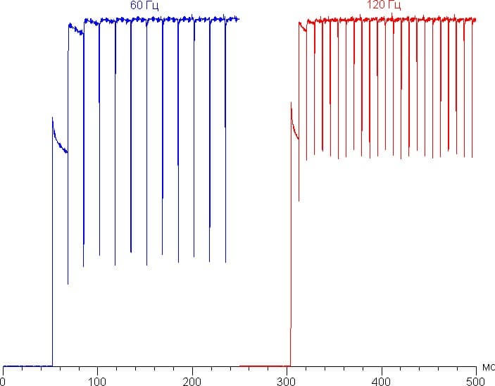 Переключение состояния элементов матрицы выполняется практически мгновенно, но на фронте включения может присутствовать ступенька шириной примерно 17 мс (что соответствует частоте обновления экрана примерно в 60 Гц), или примерно 11 мс (90 Гц), или примерно 8 мс (120 Гц). Например, так выглядит зависимость яркости от времени при переходе от черного к белому в случае режимов 60 Гц и 120 Гц:
