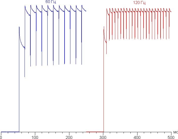 В режимах 90 и 120 Гц плавность прокрутки заметно повышается. Характер модуляции при этом принципиально не меняется, только основная частота возрастает до 90 и 120 Гц соответственно.