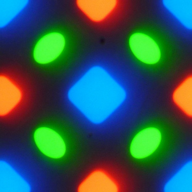На фрагменте выше можно насчитать 4 зеленых субпикселя, 2 красных (4 половинки) и 2 синих (1 целый и 4 четвертушки), при этом, повторяя эти фрагменты, можно выложить весь экран без разрывов и перехлеста. Для таких матриц компания Samsung ввела наименование PenTile RGBG. Разрешение экрана производитель считает по зеленым субпикселям, по двум другим оно будет ниже. Присутствуют некоторая неровность контрастных границ и другие артефакты, но из-за высокого разрешения они лишь минимально сказываются на качестве изображения.