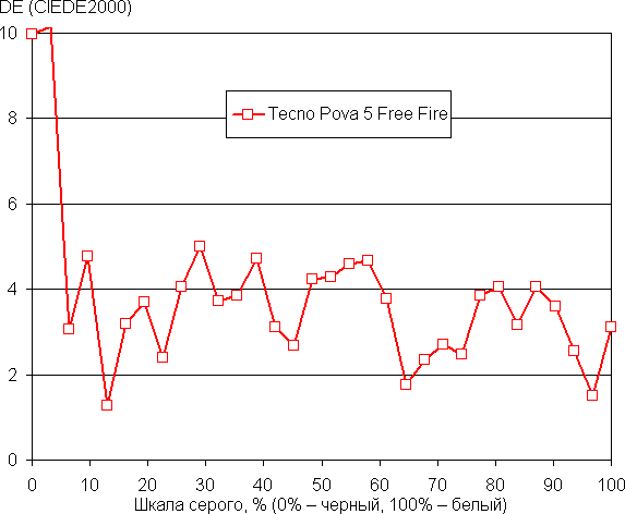 В принципе, яркий свет может приводить к нарушению суточного (циркадного) ритма (см. статью про iPad Pro с дисплеем 9,7 дюйма), но все решается снижением яркости до низкого, но еще комфортного уровня, а искажать цветовой баланс, уменьшая вклад синего, нет абсолютно никакого смысла. Эту настройку можно использовать для коррекции цветового баланса. Результат после ручной коррекции (ползунок как на снимке выше) хороший, так как цветовая температура становится достаточно близкой к стандартным 6500 К, а отклонение от спектра абсолютно черного тела (ΔE) остается ниже 10, что для потребительского устройства считается приемлемым показателем. При этом цветовая температура и ΔE мало изменяются от оттенка к оттенку — это положительно сказывается на визуальной оценке цветового баланса. (Самые темные области шкалы серого можно не учитывать, так как там баланс цветов не имеет большого значения, да и погрешность измерений цветовых характеристик на низкой яркости большая.)