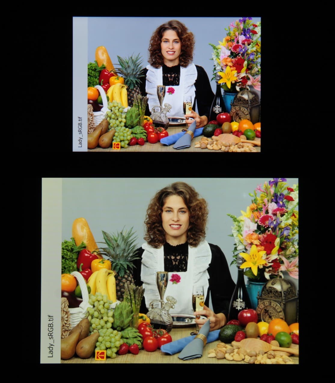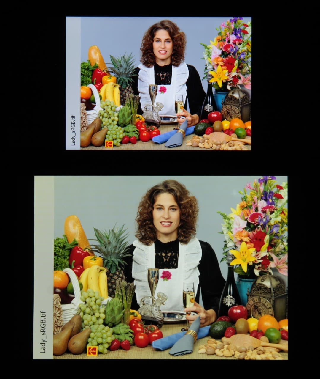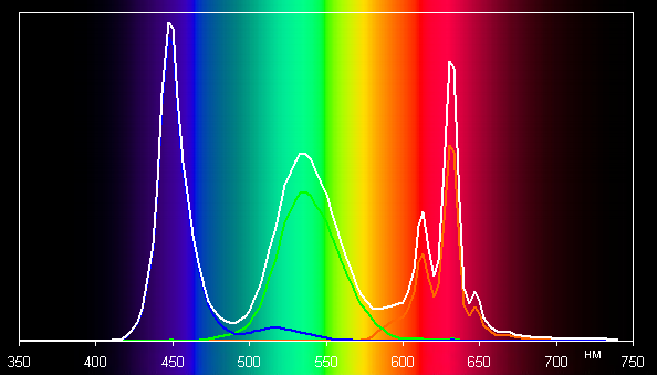 Спектры компонент достаточно хорошо разделены, что и обуславливает широкий цветовой охват. Для потребительского устройства широкий цветовой охват является недостатком, поскольку в итоге цвета изображений — рисунков, фотографий и фильмов, — ориентированных на пространство sRGB (а таких подавляющее большинство), имеют неестественную насыщенность. Особенно это заметно на узнаваемых оттенках, например на оттенках кожи. Результат приведен на фотографиях выше.