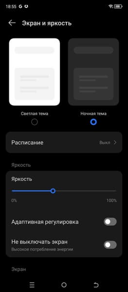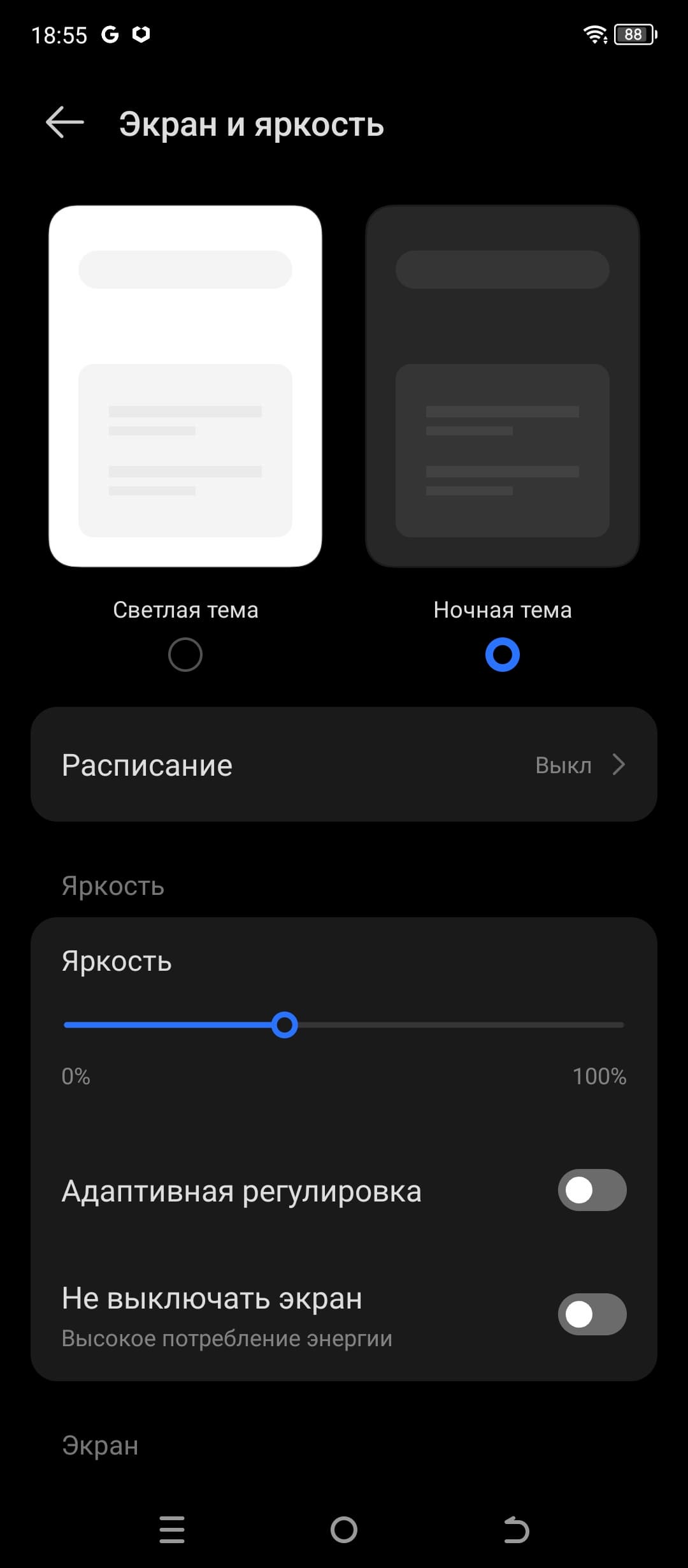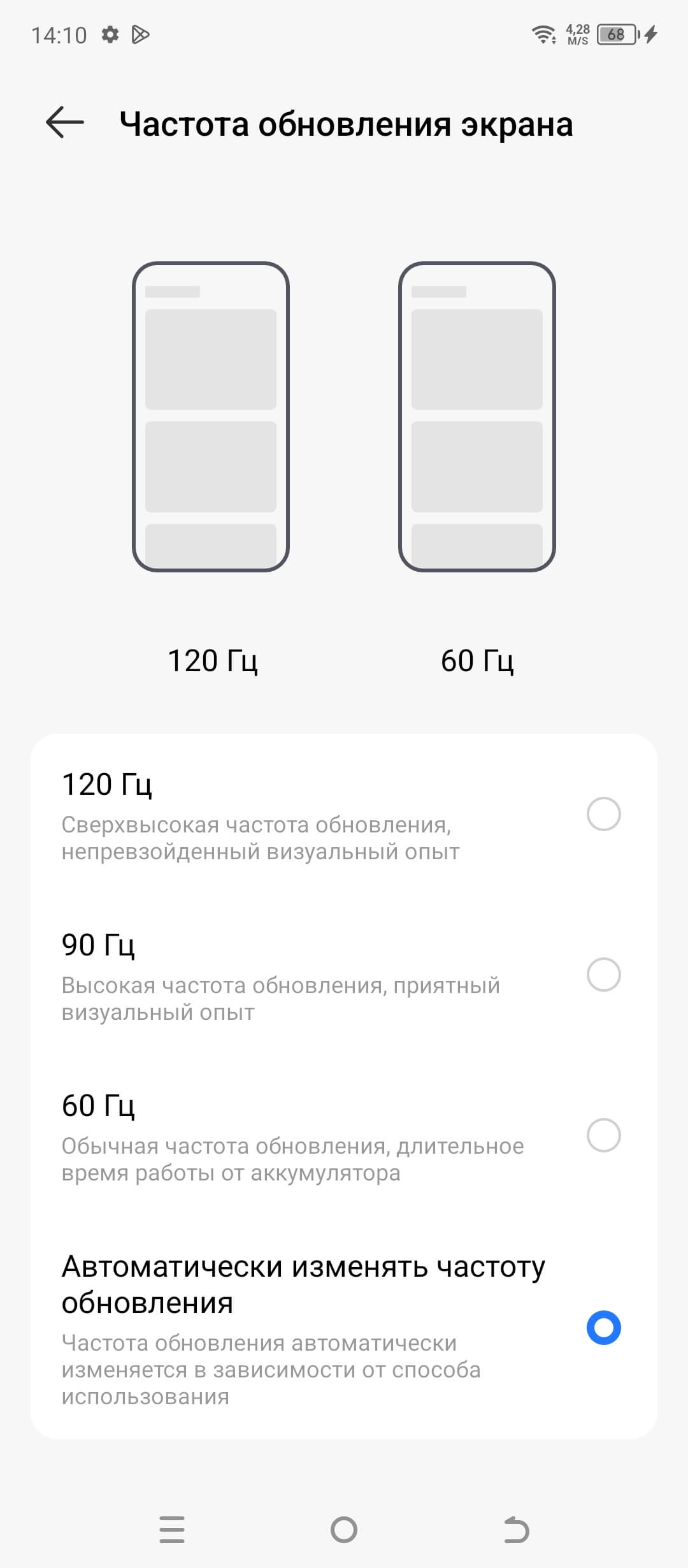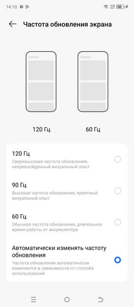 В настройках экрана можно включить режим с повышенной до 90 и 120 Гц частотой обновления, что приводит как минимум к увеличению плавности прокрутки списков в меню.