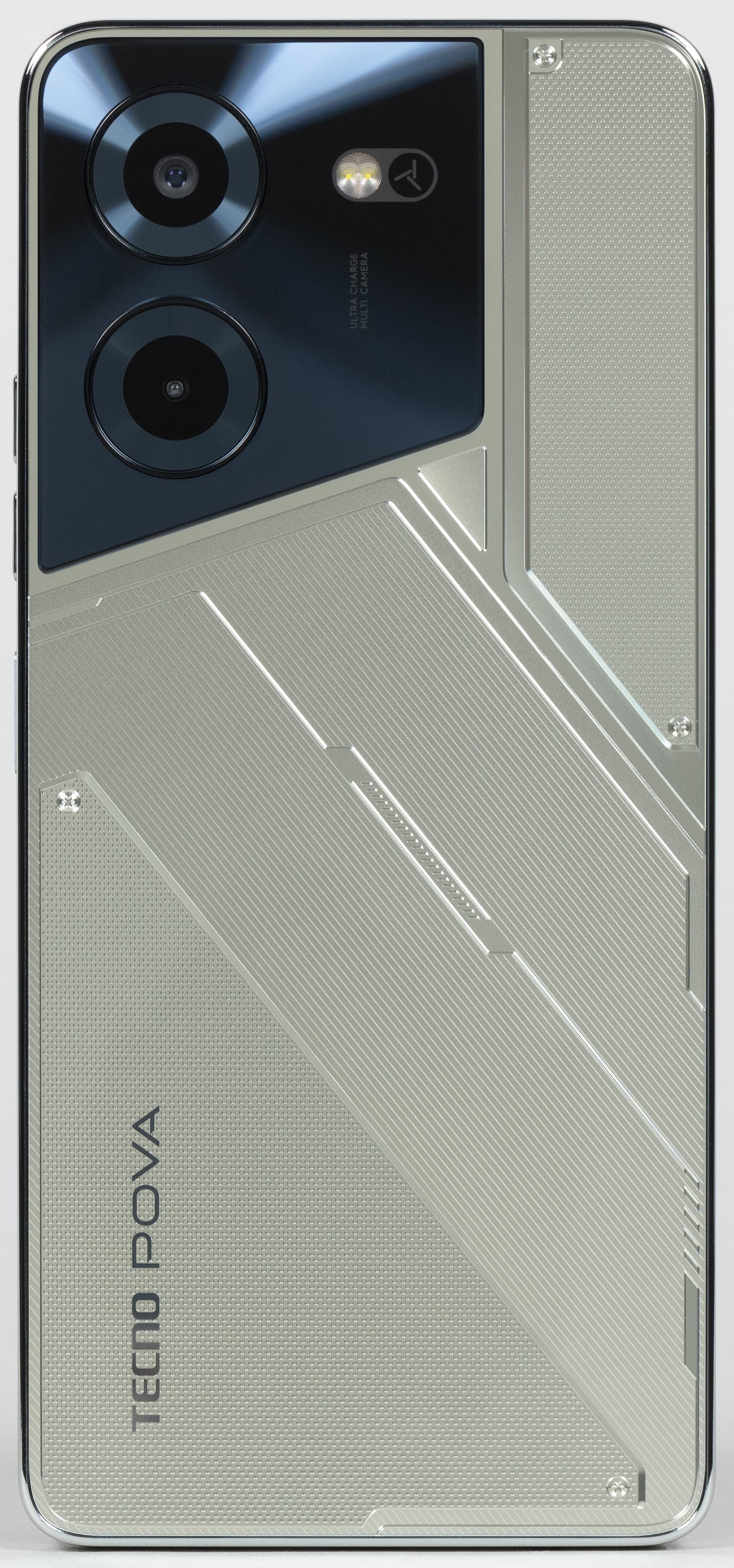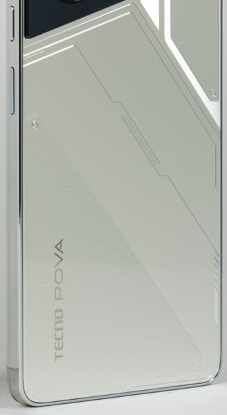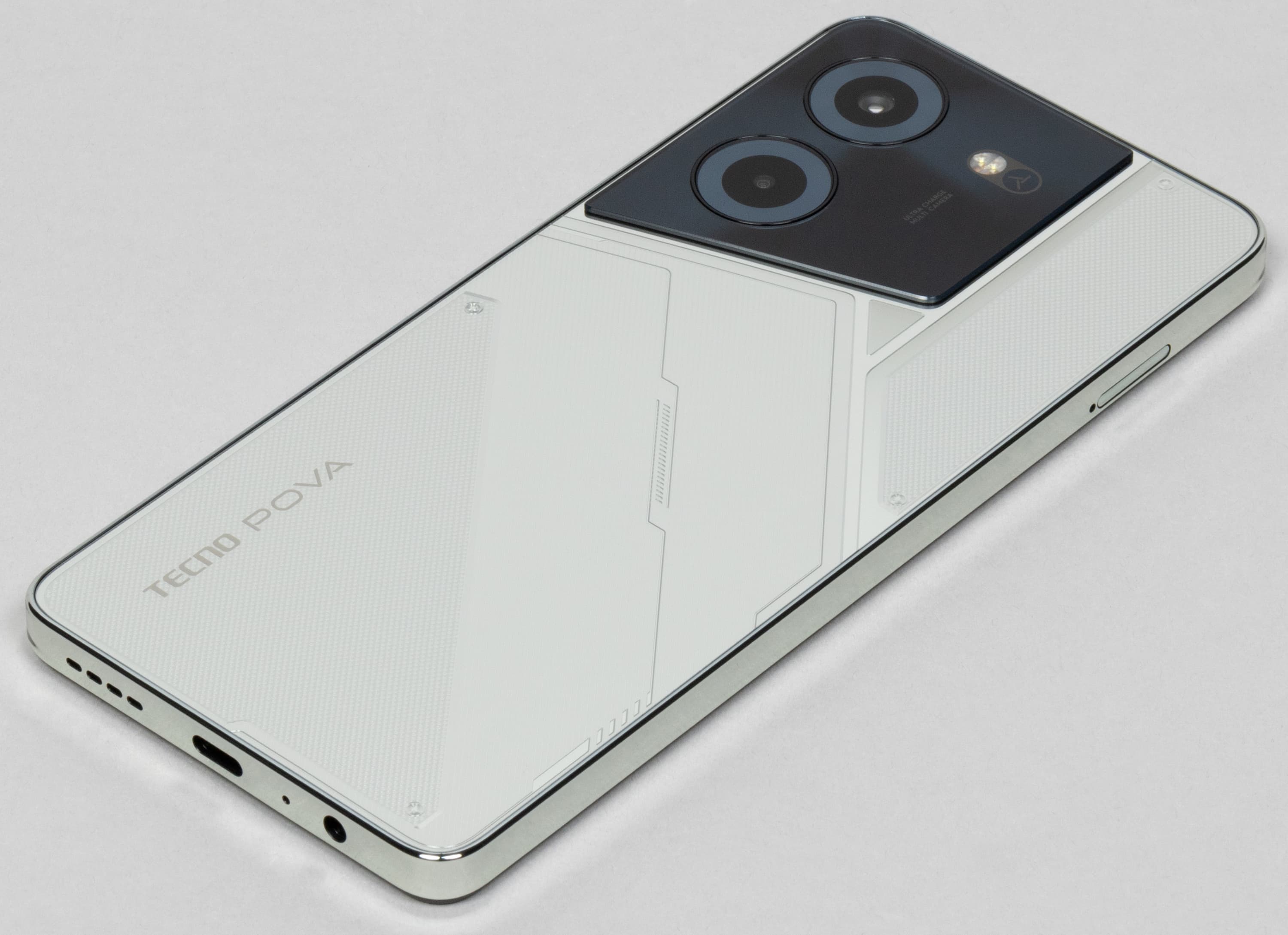 Tecno Pova 5 Pro выполнен в актуальном айфоноподобном дизайне без обтекаемых форм и загнутых краев. Основные поверхности у него плоские, бока прямые и широкие, переходы между гранями выраженные, но не слишком острые. В руке смартфон лежит неплохо, насколько это применимо к крупному и тяжелому аппарату. Со стола его поднимать легко.