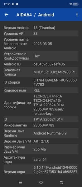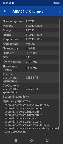 Смартфон Tecno Pova 5 работает на восьмиядерной SoC Mediatek MT8781 Helio G99, роль графического процессора выполняет GPU Mali-G57 MC2. Объем оперативной памяти LPDDR4 составляет 8 ГБ с возможностью виртуального расширения. Объем встроенного хранилища UFS 2.2 — 128 или 256 ГБ. Также в смартфон можно установить карту памяти. Поддерживается и подключение внешних устройств к порту USB Type-C в режиме USB OTG. А вот режим DisplayPort Alt Mode для USB Type-C (вывод изображения и звука на внешнее устройство при подключении к порту USB), по всей видимости, не поддерживается (отчет программы usbview.exe).