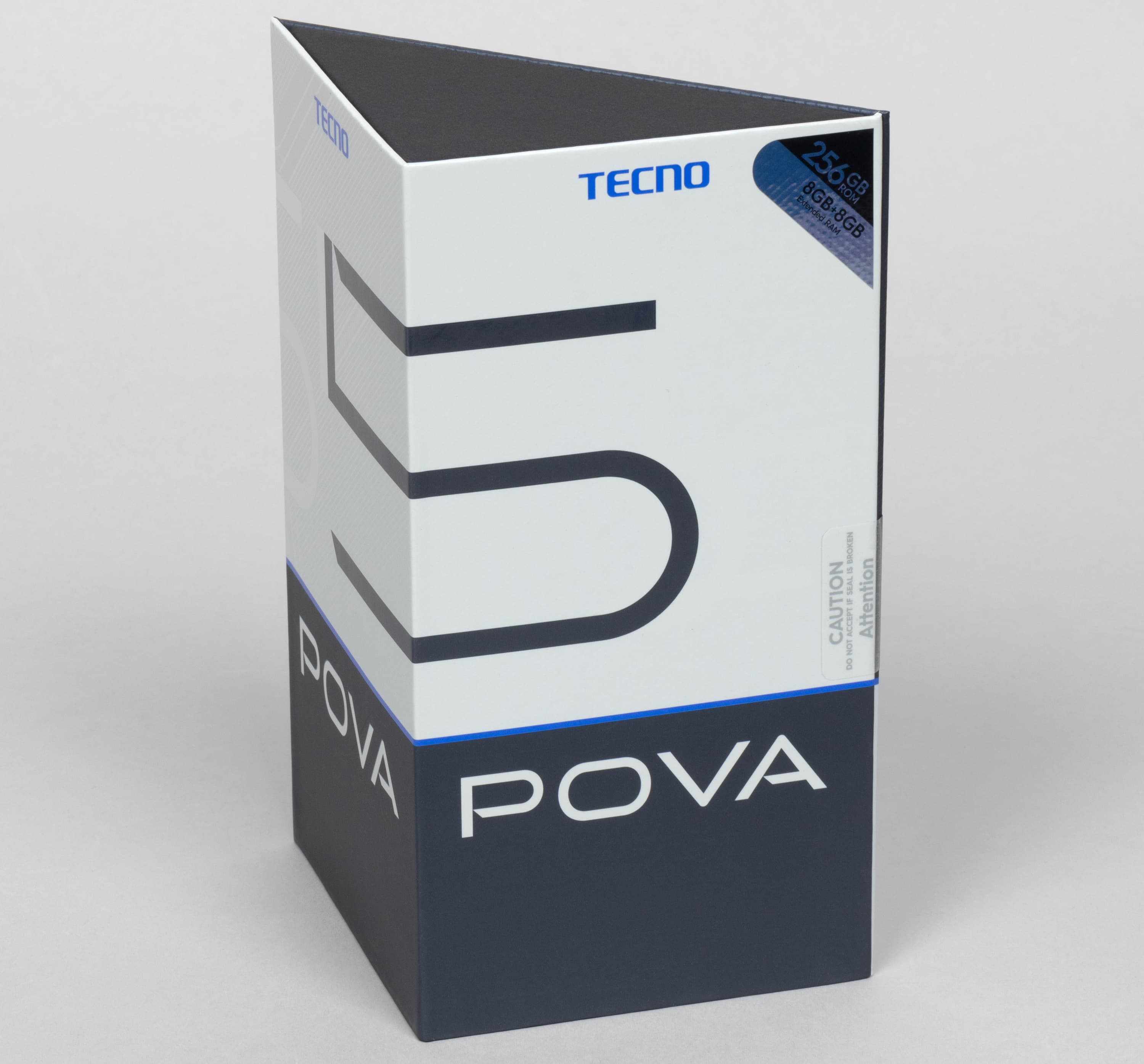 Смартфон Tecno Pova 5 поставляется в картонной коробке очень необычной формы — треугольной призмы. Выглядит это действительно эффектно, но продавцы вряд ли обрадуются, поскольку даже пару таких упаковок невозможно уложить друг на друга без внешней коробки, не то что нести их стопкой.