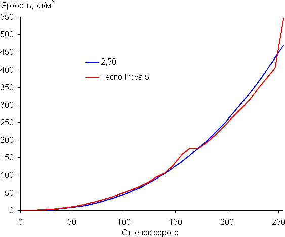 Построенная по 32 точкам с равным интервалом по численному значению оттенка серого гамма-кривая не выявила завала ни в светах, ни в тенях. Показатель аппроксимирующей степенной функции равен 2,50, что выше стандартного значения 2,2, потому и изображение слегка затемнено. При этом реальная гамма-кривая существенно отклоняется от степенной зависимости: