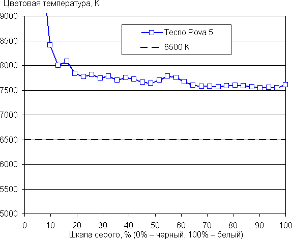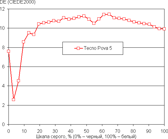 Баланс оттенков на шкале серого даже после максимальной коррекции средний, так как цветовая температура остается существенно выше стандартных 6500 К, а отклонение от спектра абсолютно черного тела (ΔE) на большей части шкале серого выше 10 единиц, что даже для потребительского устройства считается средним показателем (без коррекции на белом поле 9800 К и 2,3, соответственно). Однако при этом цветовая температура и ΔE мало изменяются от оттенка к оттенку — это положительно сказывается на визуальной оценке цветового баланса. (Самые темные области шкалы серого можно не учитывать, так как там баланс цветов не имеет большого значения, да и погрешность измерений цветовых характеристик на низкой яркости большая.)