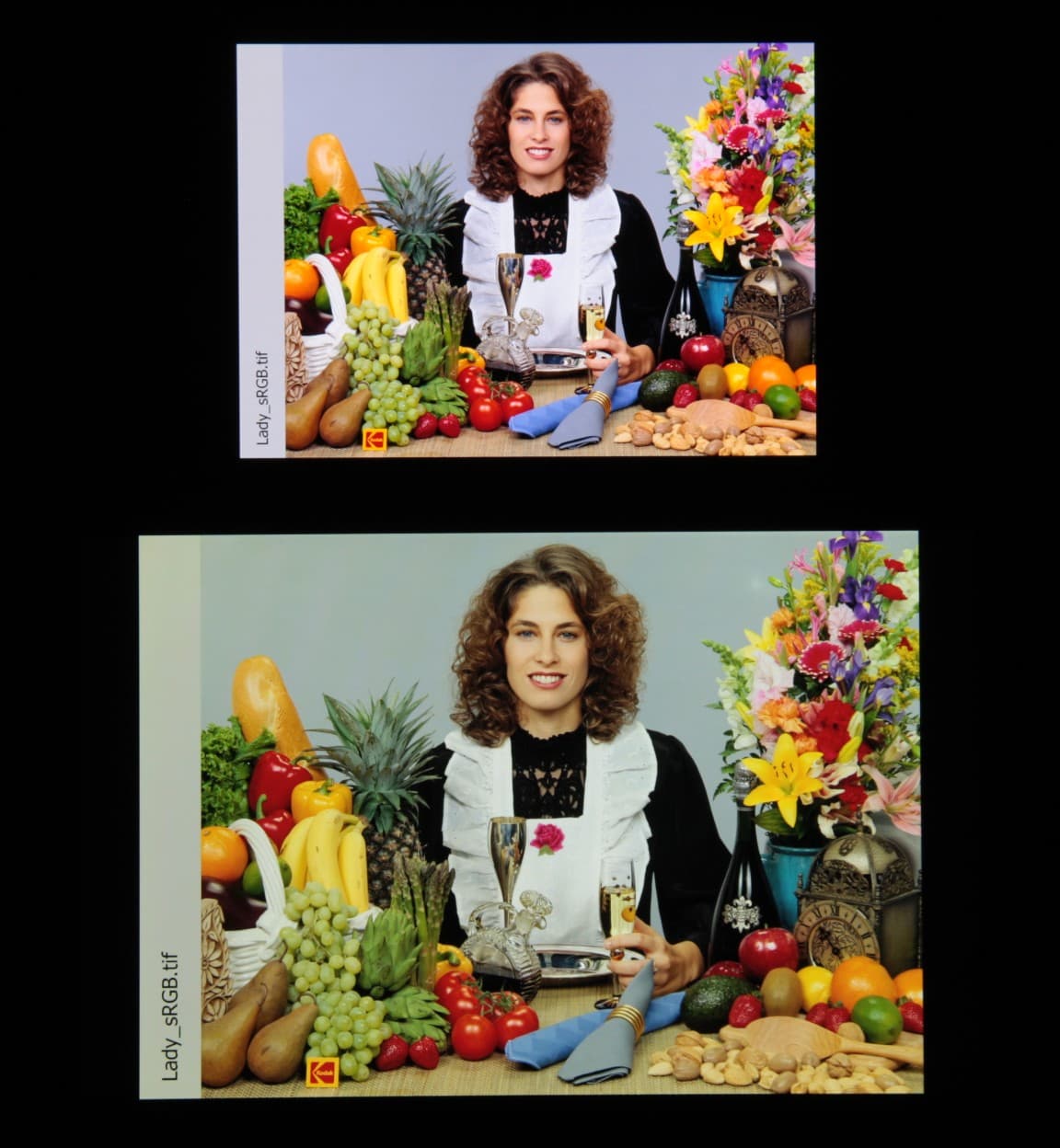 Цвета на экране смартфона перенасыщены (обратите внимание на помидоры, бананы, салфетку и оттенок лица), а цветовой баланс заметно отличается. Напомним, что фотография не может служить надежным источником сведений о качестве цветопередачи и приводится только для условной наглядной иллюстрации. В частности, выраженный красноватый оттенок белого и серого полей, присутствующий на фотографиях экрана смартфона, при перпендикулярном взгляде визуально отсутствует, что подтверждается аппаратными тестами с помощью спектрофотометра. Причина в том, что спектральная чувствительность матрицы фотоаппарата неточно совпадает с этой характеристикой человеческого зрения.