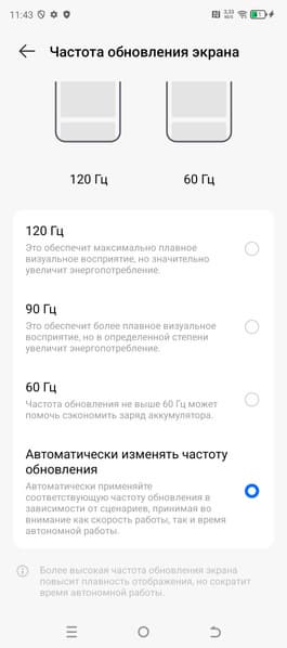 В настройках экрана можно включить режим с повышенной до 90 и 120 Гц частотой обновления: