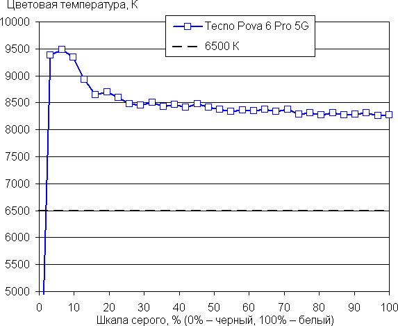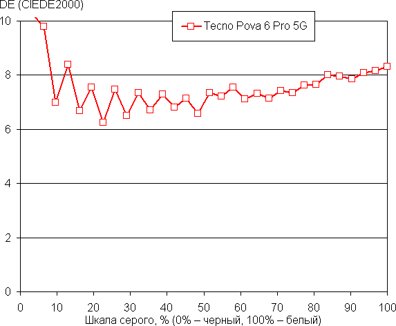 Баланс оттенков на шкале серого компромиссный, так как цветовая температура заметно выше стандартных 6500 К, но отклонение от спектра абсолютно черного тела (ΔE) меньше 10 единиц, что для потребительского устройства считается хорошим показателем. При этом цветовая температура и ΔE мало изменяются от оттенка к оттенку — это положительно сказывается на визуальной оценке цветового баланса. (Самые темные области шкалы серого можно не учитывать, так как там баланс цветов не имеет большого значения, да и погрешность измерений цветовых характеристик на низкой яркости большая.)