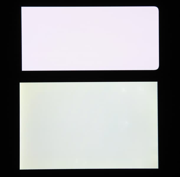 Экран характеризуется великолепными углами обзора. Правда, белый цвет при отклонении на большие углы приобретает легкий сине-зеленый оттенок, но черный цвет остается просто черным под любыми углами. Он настолько черный, что параметр контрастности в данном случае просто неприменим. Для сравнения приведем фотографии, на которых на экраны смартфона и второго участника (Nexus 7; снизу — Nexus 7, сверху — смартфон, далее их можно различать по размеру) выведены одинаковые изображения, при этом яркость экранов изначально установлена примерно на 200 кд/м², а цветовой баланс на фотоаппарате принудительно переключен на 6500 К.