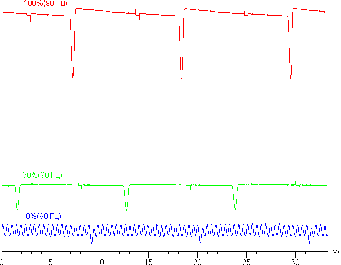 Видно, что на высокой и средней яркости частота модуляции увеличилась до 90 Гц, а на низкой характер модуляции такой же, как и в случае частоты обновления 60 Гц. Видимого мерцания всё так же нет.