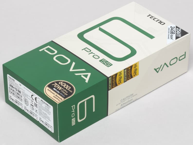 Смартфон Tecno Pova 6 Pro 5G поставляется в твердой картонной упаковке со сдержанным оформлением.
