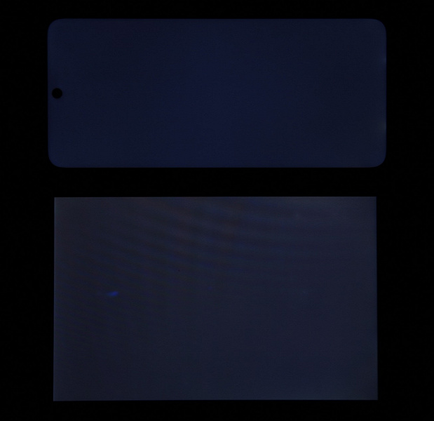 При перпендикулярном взгляде равномерность черного поля средняя (для наглядности яркость подсветки на смартфоне установлена на максимум):
