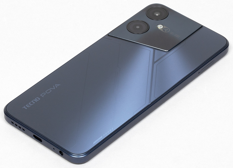 Tecno Pova Neo 3 получил оформление в стиле своей линейки: его задняя крышка украшена геометрическим узором с намеком на игровую составляющую. При этом корпус выполнен в актуальном прямоугольном айфоноподобном дизайне без обтекаемых форм: только плоские панели, широкие боковины и четкие переходы между гранями.