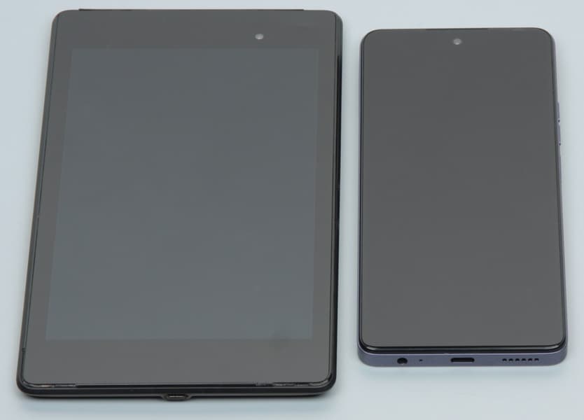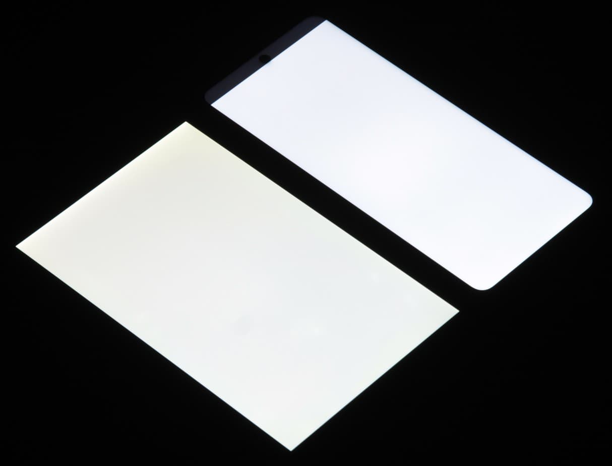 Лицевая поверхность экрана выполнена в виде стеклянной пластины с зеркально-гладкой поверхностью, устойчивой к появлению царапин. Судя по отражению объектов, антибликовые свойства экрана лучше, чем у экрана Google Nexus 7 (2013) (далее просто Nexus 7). Для наглядности приведем фотографию, на которой в выключенных экранах отражается белая поверхность (слева — Nexus 7, справа — Tecno Spark 10 Pro, далее их можно различать по размеру):