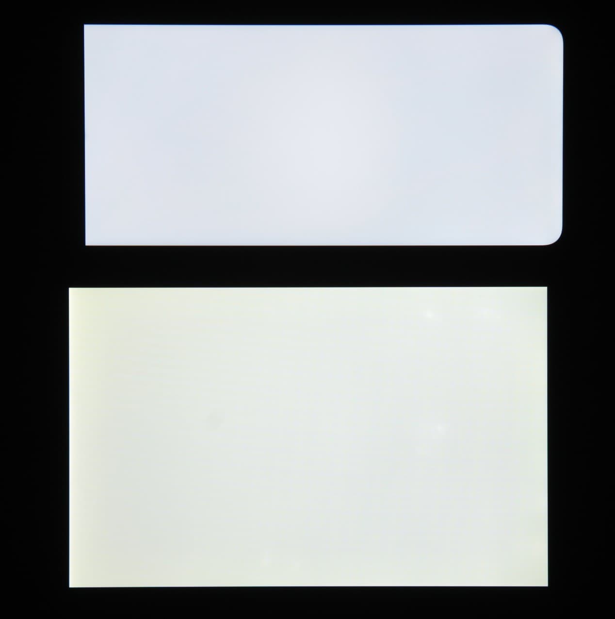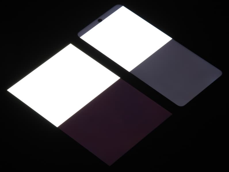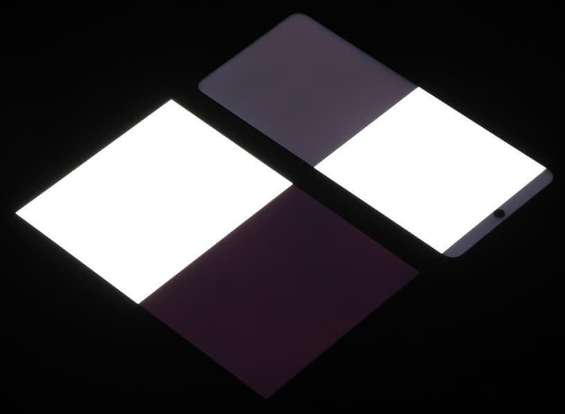 Яркость под углом у экранов уменьшилась (как минимум в 5 раз, исходя из разницы в выдержке), но в случае смартфона яркость снизилась меньше. Черное поле при отклонении по диагонали сильно высветляется и приобретает фиолетовый оттенок. Фотографии ниже это демонстрируют (яркость белых участков в перпендикулярном плоскости экранов направлении одинаковая!):