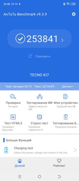 Смартфон получил SoC, анонсированную 16 июня 2021 года и производимую по 12-нанометровому техпроцессу. Это далеко не свежая и не мощная платформа бюджетного уровня, выдающая немногим более 200К баллов в AnTuTu. Ее графический ускоритель поддерживает API Vulkan, но это, безусловно, не игровое решение, хотя в простенькие игры на смартфоне поиграть вполне можно. Также Tecno Spark 10 Pro, как и другие смартфоны компании, оснащен игровым движком HyperEngine 2.0 и специальным игровым режимом GameTurbo, однако это, скорее, рабочая лошадка для организационных нужд. С плавной работой интерфейса процессор вполне справляется.