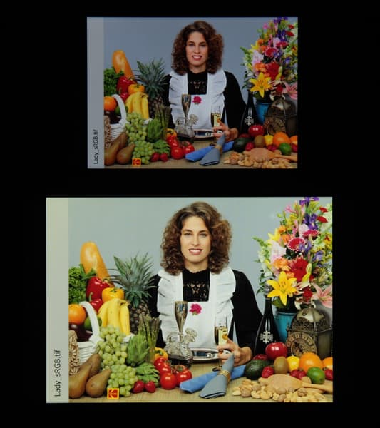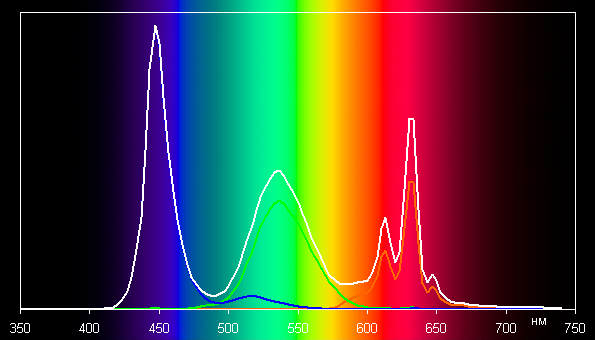 Спектры компонент достаточно хорошо разделены, что и обуславливает широкий цветовой охват. Для потребительского устройства широкий цветовой охват является недостатком, поскольку в итоге цвета изображений — рисунков, фотографий и фильмов, — ориентированных на пространство sRGB (а таких подавляющее большинство), имеют неестественную насыщенность. Особенно это заметно на узнаваемых оттенках, например на оттенках кожи. Результат приведен на фотографиях выше.
