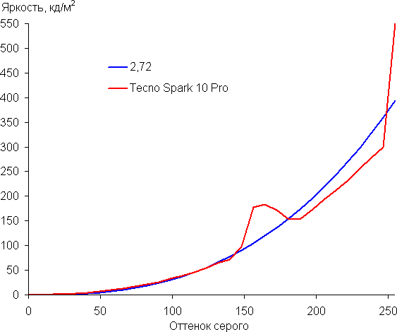 Построенная по 32 точкам с равным интервалом по численному значению оттенка серого гамма-кривая не выявила завала ни в светах, ни в тенях. Показатель аппроксимирующей степенной функции равен 2,72, что выше стандартного значения 2,2, потому и изображение затемнено. При этом реальная гамма-кривая существенно отклоняется от степенной зависимости: