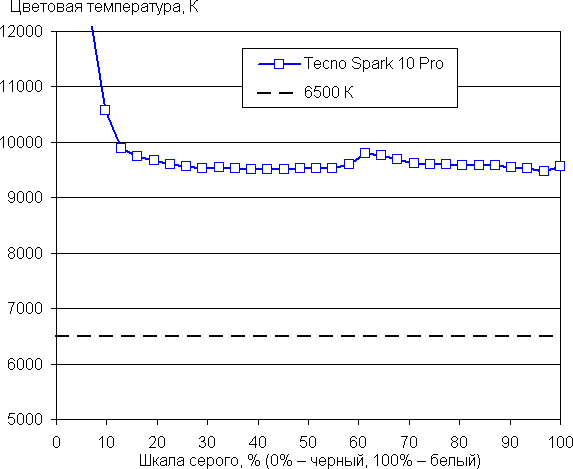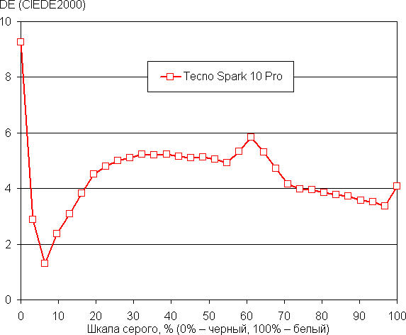 Баланс оттенков на шкале серого компромиссный, так как цветовая температура существенно выше стандартных 6500 К. Однако отклонение от спектра абсолютно черного тела (ΔE) на шкале серого ниже 3, что само по себе для потребительского устройства считается великолепным показателем. При этом цветовая температура и ΔE мало изменяются от оттенка к оттенку — это положительно сказывается на визуальной оценке цветового баланса. (Самые темные области шкалы серого можно не учитывать, так как там баланс цветов не имеет большого значения, да и погрешность измерений цветовых характеристик на низкой яркости большая.)