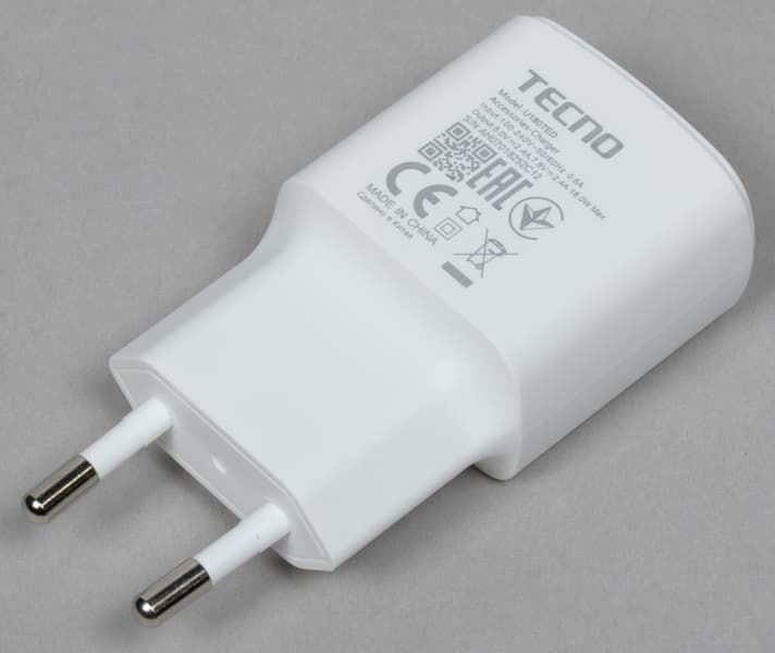 В комплекте со смартфоном идет соединительный кабель USB-C и сетевое зарядное устройство с максимальной выходной мощностью 18 Вт.