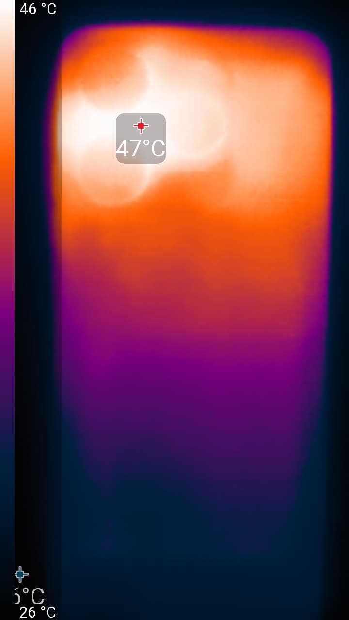 Нагрев больше в верхней части аппарата, что, видимо, соответствует расположению микросхемы SoC. По данным теплокамеры, максимальный нагрев составил 47 градусов (при температуре окружающего воздуха в 24 градуса), это далеко не самый высокий нагрев в случае данного теста в сравнении с другими современными смартфонами.