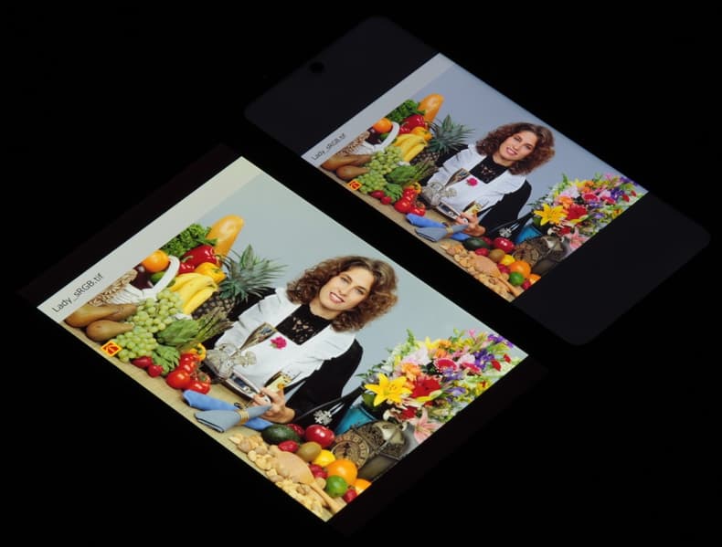 Цвета на экране смартфона явно перенасыщены, картинка затемнена, а цветовой баланс у экранов различается. Напомним, что фотография не может служить надежным источником сведений о качестве цветопередачи и приводится только для условной наглядной иллюстрации. Причина в том, что спектральная чувствительность матрицы фотоаппарата неточно совпадает с этой характеристикой человеческого зрения.