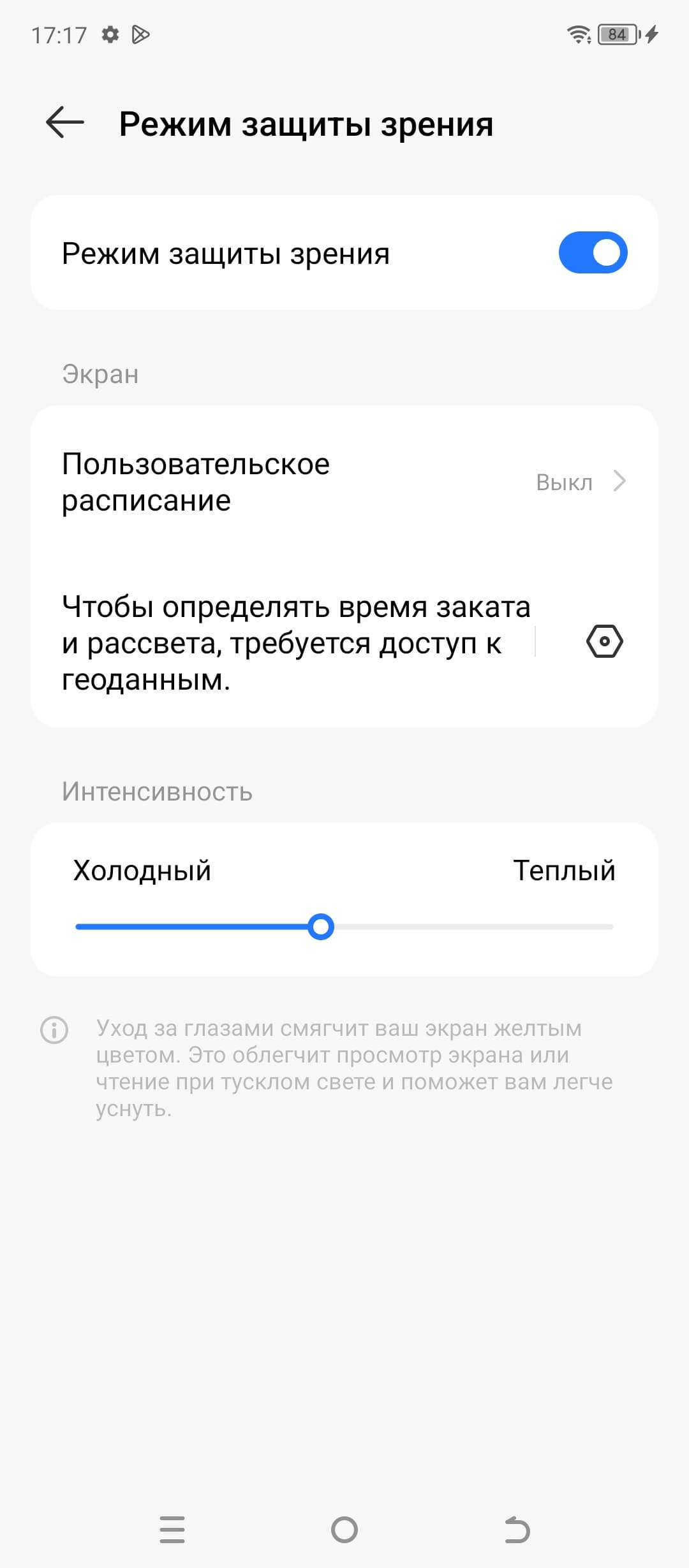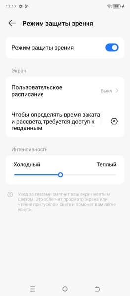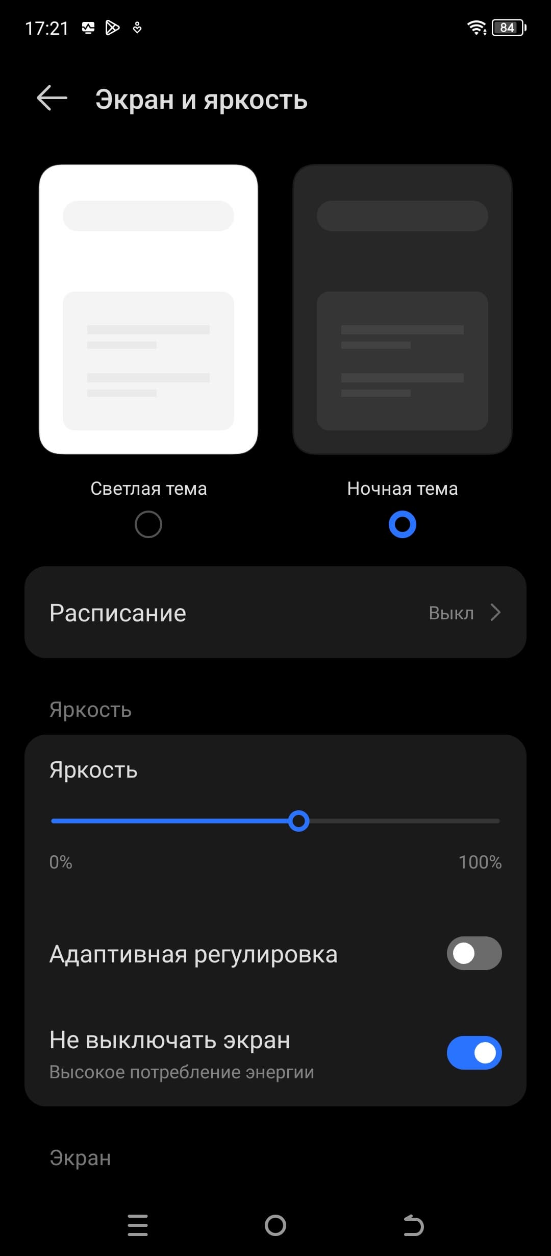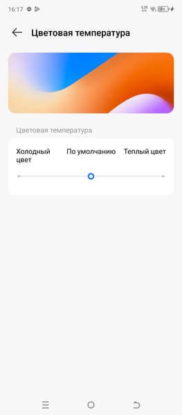 При ручном управлении яркостью и при выводе белого поля во весь экран максимальное значение яркости составило 460 кд/м². Максимальная яркость высокая (хотя есть момент, о котором ниже), и, учитывая отличные антибликовые свойства, смартфоном как-то можно будет пользоваться даже в солнечный день вне помещения. Минимальное значение яркости — 5 кд/м², поэтому в полной темноте яркость можно понизить до комфортного значения. В наличии автоматическая регулировка яркости по датчику освещенности (он находится на фронтальной панели близко к ее верхнему краю правее решетки фронтального громкоговорителя). В автоматическом режиме при изменении внешних условий освещенности яркость экрана как повышается, так и понижается. Работа этой функции зависит от положения ползунка регулировки яркости: им пользователь может попытаться выставить желаемый уровень яркости в текущих условиях. Если оставить все по умолчанию, то в полной темноте функция автояркости уменьшает яркость до 5 кд/м² (темновато), в условиях освещенного искусственным светом офиса (примерно 550 лк) устанавливает на 120 кд/м² (нормально), а условно под прямыми лучами солнца повышает до 460 кд/м² (максимум, так и нужно). Результат по умолчанию нас не удовлетворил, поэтому мы попробовали повысить яркость в полной темноте. Яркость стала выше, но после цикла повышения внешней освещенности и ее снижения, все вернулось к тем же значениям, что были до вмешательства. Получается, что функция автоподстройки яркости работает более-менее адекватно, но не позволяет пользователю настраивать свою работу под индивидуальные требования. На любом уровне яркости значимая модуляция подсветки отсутствует, поэтому нет и никакого мерцания экрана.