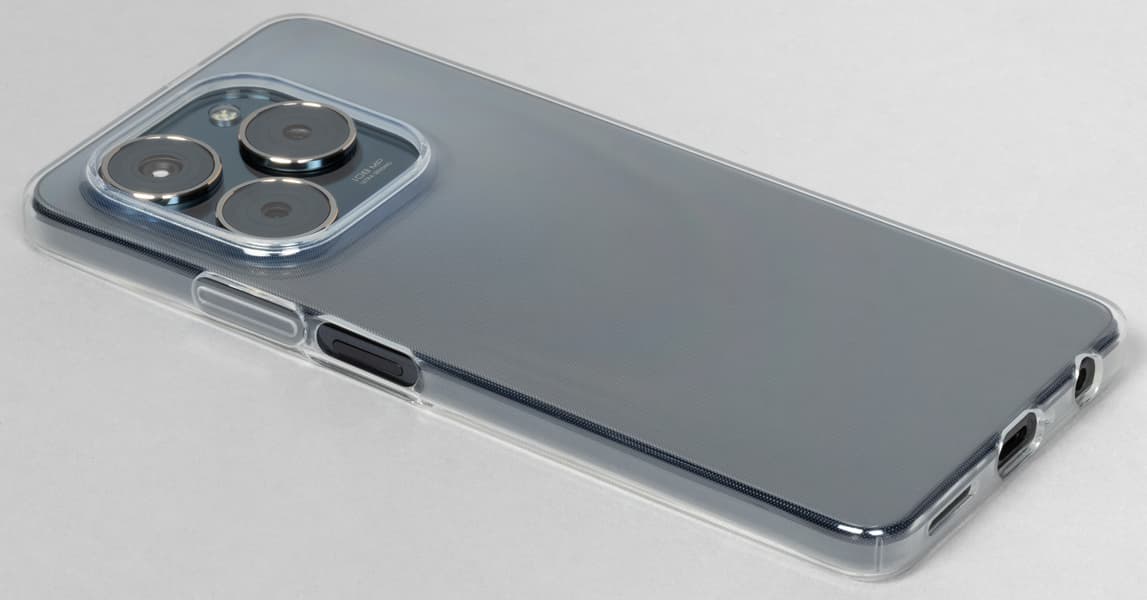 Комплектный силиконовый чехол — прозрачный и гибкий. Он прикрывает выступающие камеры от соприкосновения с поверхностью стола своим приподнятым вокруг блока бортиком.