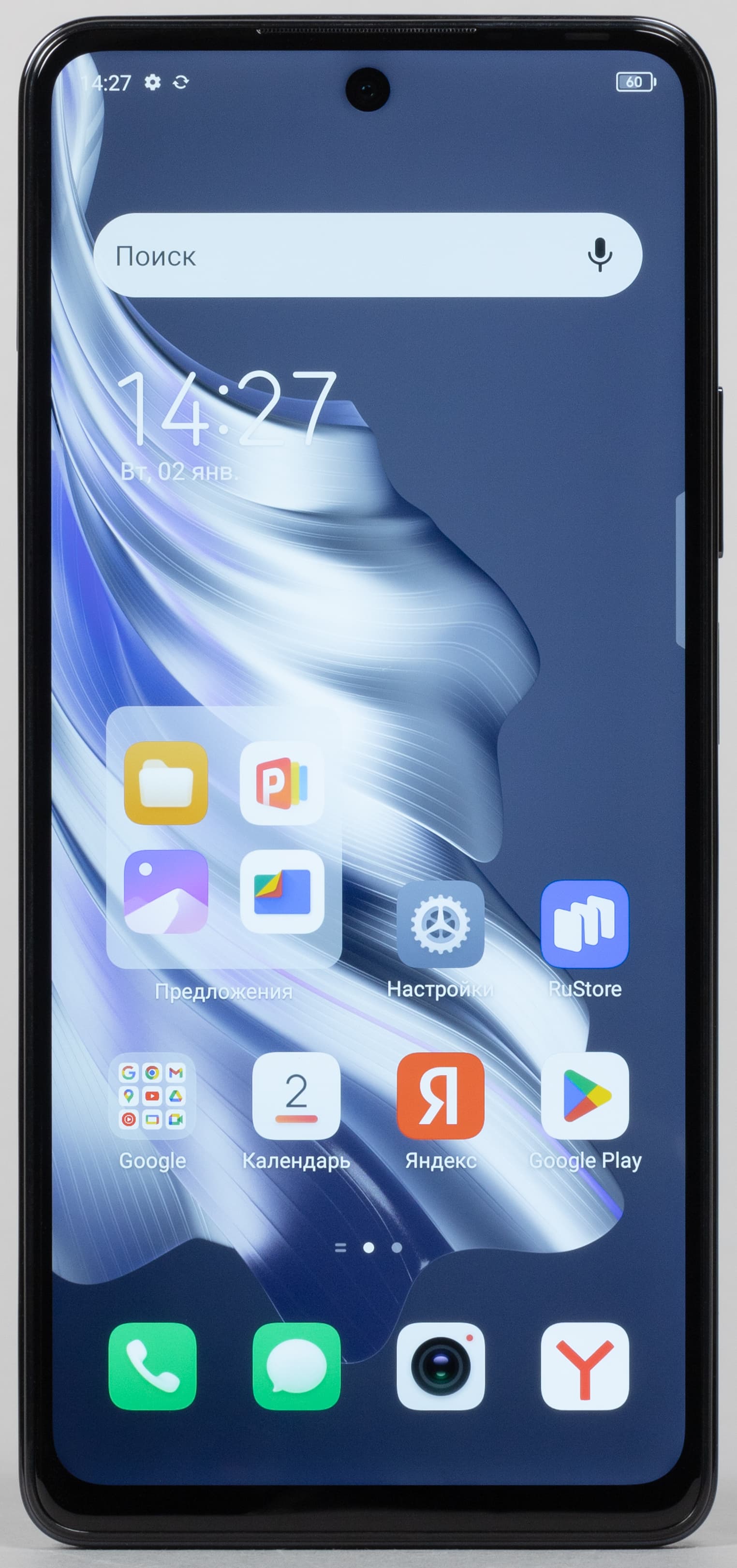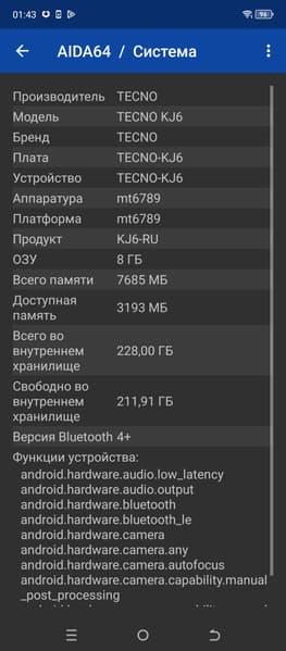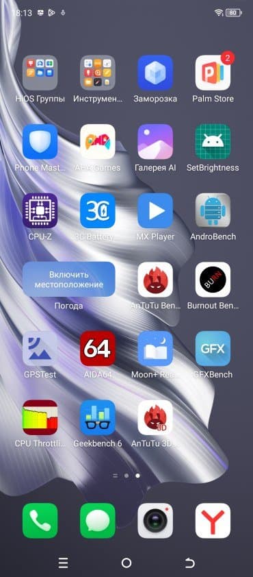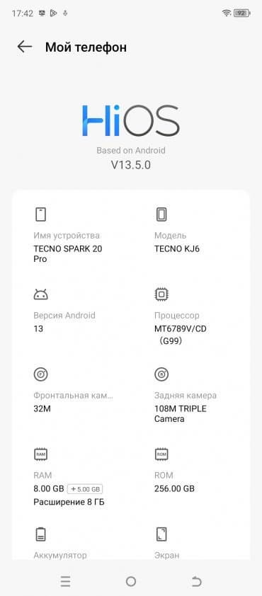 В качестве программной платформы Tecno Spark 20 Pro использует ОС Android 13 с собственной оболочкой HiOS 13.5. Это не очень легкая и быстрая, но стабильная оболочка с аккуратным русским переводом, удаляемыми дополнительными программами и отсутствием рекламы. Из особенностей — Dynamic Port, до боли знакомый уже визуальный динамический эффект, создающий виртуальный «островок» вокруг фронтальной камеры с отображением информации о статусе заряда и т. п.