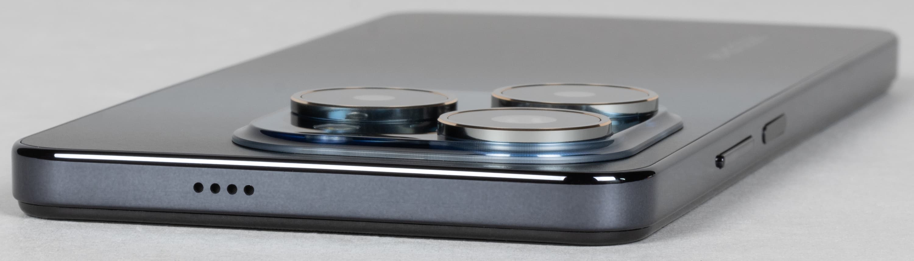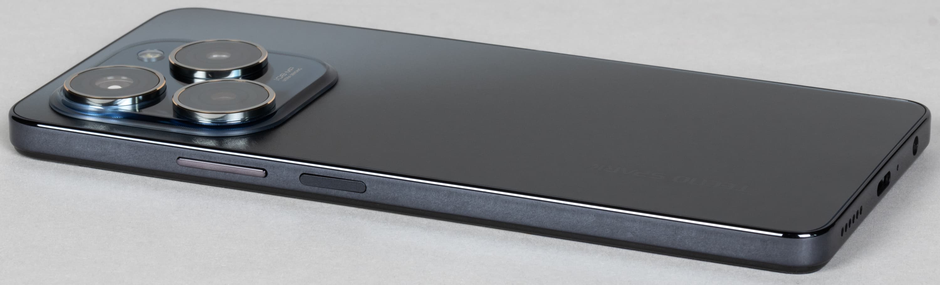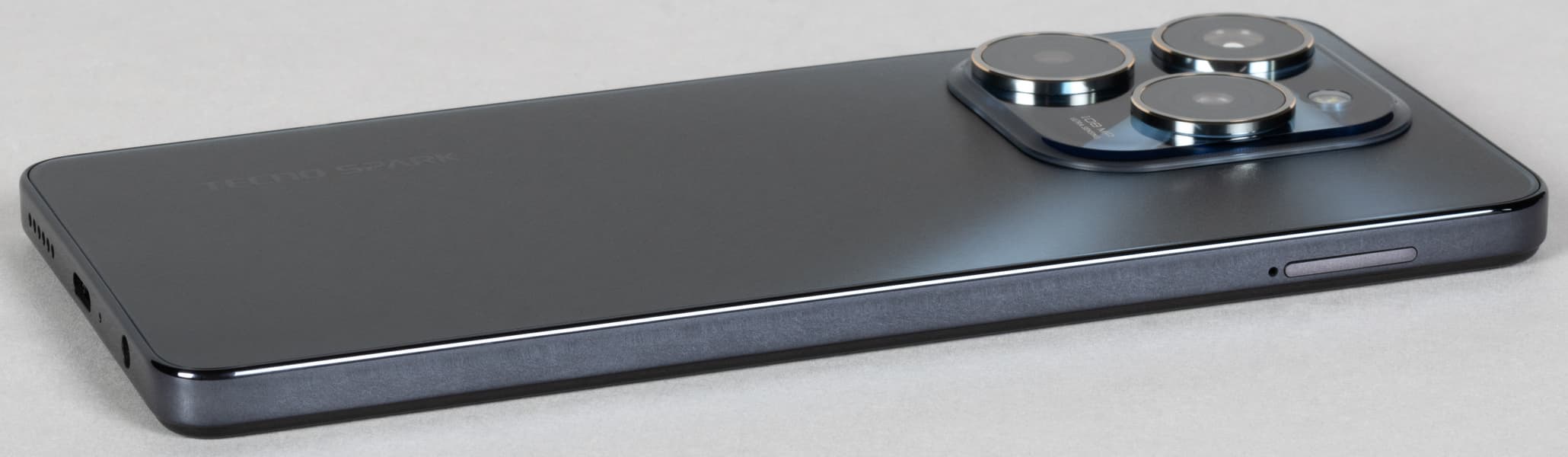 К сожалению, боковая рамка гладкая, лакированная и скользкая. У азиатов слово «люкс» до сих пор ассоциируется с блеском. На деле же матовые бока (в том числе у младших моделей этой серии Tecno) гораздо практичнее этих скользких боковин.