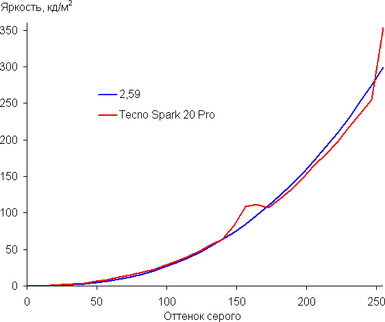Построенная по 32 точкам с равным интервалом по численному значению оттенка серого гамма-кривая не выявила завала ни в светах, ни в тенях. Показатель аппроксимирующей степенной функции равен 2,59, что выше стандартного значения 2,2. При этом реальная гамма-кривая существенно отклоняется от степенной зависимости: