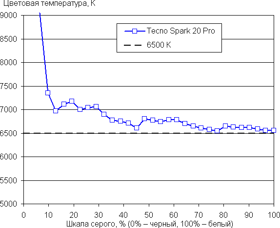 В принципе, яркий свет может приводить к нарушению суточного (циркадного) ритма (см. статью про iPad Pro с дисплеем 9,7 дюйма), но все решается снижением яркости до низкого, но еще комфортного уровня, а искажать цветовой баланс, уменьшая вклад синего, нет абсолютно никакого смысла. Эту настройку можно использовать для коррекции цветового баланса. Результат после ручной коррекции (ползунок как на снимке выше) хороший, так как цветовая температура становится достаточно близкой к стандартным 6500 К, а отклонение от спектра абсолютно черного тела (ΔE) остается ниже 10, что для потребительского устройства считается приемлемым показателем. При этом цветовая температура и ΔE мало изменяются от оттенка к оттенку — это положительно сказывается на визуальной оценке цветового баланса. (Самые темные области шкалы серого можно не учитывать, так как там баланс цветов не имеет большого значения, да и погрешность измерений цветовых характеристик на низкой яркости большая.)