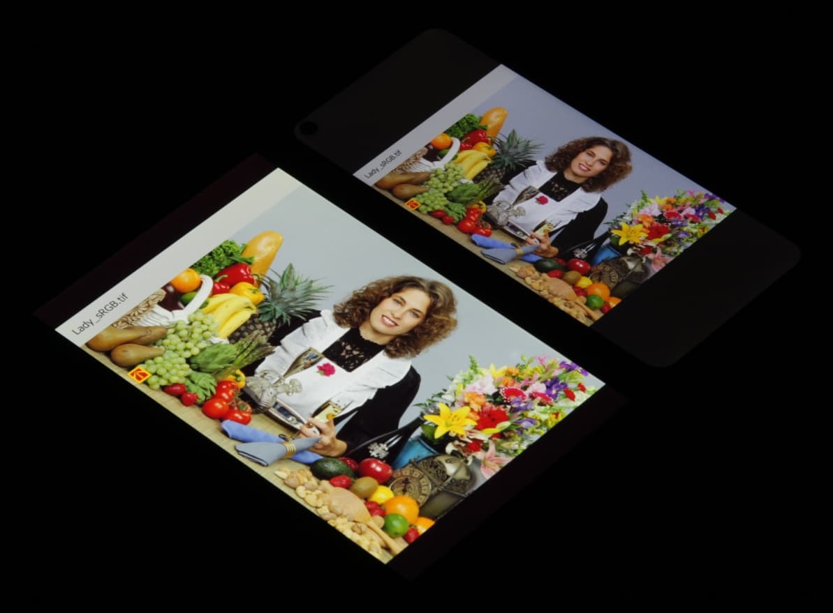 Экран имеет хорошие углы обзора без значительного сдвига цветов даже при больших отклонениях взгляда от перпендикуляра к экрану и без инвертирования оттенков. Для сравнения приведем фотографии, на которых на экраны Tecno Spark 5 и Nexus 7 выведены одинаковые изображения, при этом яркость экранов изначально установлена примерно на 200 кд/м², а цветовой баланс на фотоаппарате принудительно переключен на 6500 К.