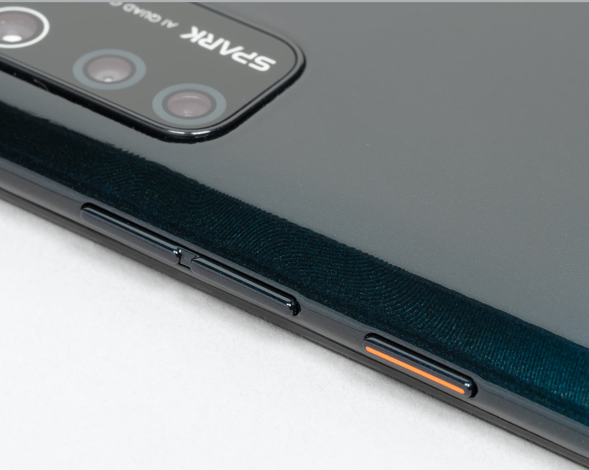 Обе аппаратные кнопки установлены на правой боковой грани, имеют приятный упругий длинный ход. Тактильных различий в их поверхности нет, но визуально клавиша питания и блокировки подчеркнута ярко-оранжевым элементом, что немного «освежает» дизайн.