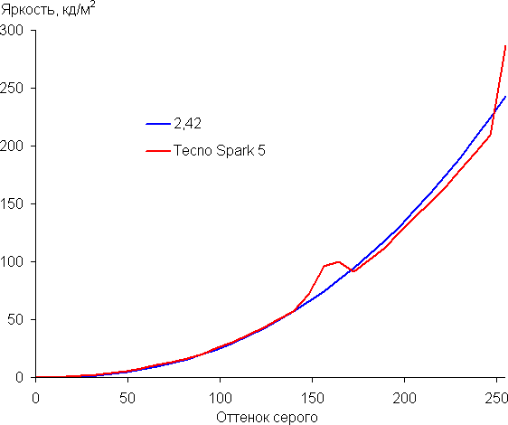 Контрастность (примерно в центре экрана) высокая — порядка 1100:1. Время отклика при переходе черный-белый-черный равно 24 мс (13 мс вкл. + 11 мс выкл.). Переход между полутонами серого 25% и 75% (по численному значению цвета) и обратно в сумме занимает 42 мс. Построенная по 32 точкам с равным интервалом по численному значению оттенка серого гамма-кривая не выявила завала ни в светах, ни в тенях. Показатель аппроксимирующей степенной функции равен 2,42, что выше стандартного значения 2,2, но в данном случае это сравнение не уместно, так как реальная гамма-кривая сильно отклоняется от степенной зависимости: